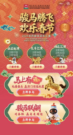 此外,「幸福加『馬』新口岸」街區活動即日起至3月1日於新口岸廣州街至北京街一帶舉行,配合農曆新年及情人節,透過節慶裝置提升街區氛圍與旅遊吸引力,引導人流走入社區促進消費,實現旅遊推廣與社區發展的良性互動。活動聯動新口岸商戶及多家綜合旅遊休閒企業,推出專屬優惠並備有豐富禮品,包括星級酒店住宿、餐飲及電影禮券,全面帶動新口岸區旅遊消費活力。活動詳情可瀏覽網頁(zapegallopgala.vangou.com/index.html)。