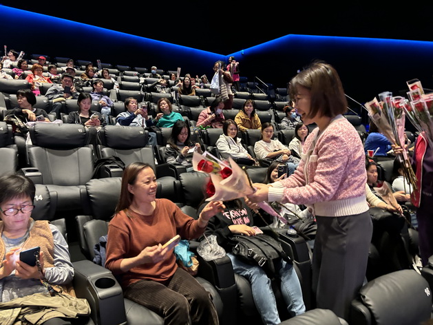 在電影放映前,婦聯總會副理事長呂綺穎及新濠社區關係及項目高級經理李婉君向參加婦女派發玫瑰,共同慶祝婦女節。呂綺穎致歡迎辭向參與者致以節日祝福和問候,她指出現代女性在生活、家庭和職場上扮演著不同的角色,往往會遇到多方面的不同程度壓力,鼓勵有需要的婦女要更多關注自身心理健康,活出好心情和美好人生。