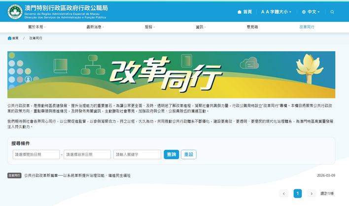 【本報消息】為進一步提高公共行政改革的透明度,擴大社會參與度,行政公職局網站由即日起增設「改革同行」欄目,旨在及時向公眾及公務員隊伍傳遞改革資訊,凝聚社會合力,共同推動澳門特區治理體系和治理能力現代化。