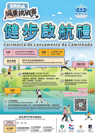 活動當天將於澳門大學校園內共同步行約2.5公里路段,寓意齊齊步出健康,完成步行者可獲贈一份紀念品。現場將設有多個健康推廣攤位,內容涵蓋中西醫諮詢、慢病篩查、健康飲食、傳染病預防、戒煙限酒、急救體驗、意外預防和運動指導等。歡迎居民、減重挑戰賽參賽者及其親友踴躍參與,有興趣人士可掃描海報上二維碼報名參與。