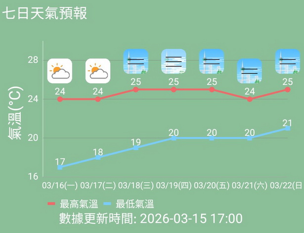 【本報消息】經過冷空氣帶來的小幅度降溫後,本澳氣溫近兩日有所回升,氣象局預測周一日間陽光充沛,氣溫約為攝氏17度至24度,展望周中至後期雲量增多,天氣潮濕及早晚有薄霧,但部份時間仍有陽光,最高氣溫會略為升至25度。