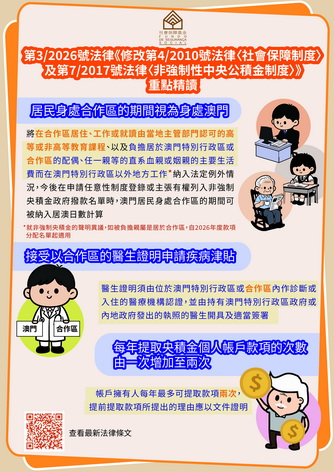 【本報消息】第3/2026號法律《修改第4/2010號法律〈社會保障制度〉及第7/2017號法律〈非強制性中央公積金制度〉》,將自2026年3月24日起生效。