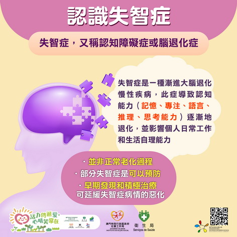 她重申失智症同樣早期發現和治療後,可延緩疾病發展,故當局以「早期預防、早期發現、早期診斷、早期治療、早期支援」為防治目標,並與社工局合作加大宣傳力度,去年就推出了「失智症友善市民」先導計劃,都是希望向市民推廣及早發現身邊人是否出現失智症症狀,及早診斷和治療。