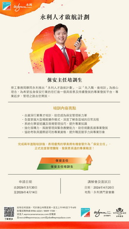 【本報消息】為支持本澳拓展多元職涯路向,勞工事務局和永利澳門合作推出「永利人才啟航計劃」,以「先入職、後培訓」方式,為本澳居民提供就業機會與系統化職業培訓,計劃由3月30日起接受申請。
