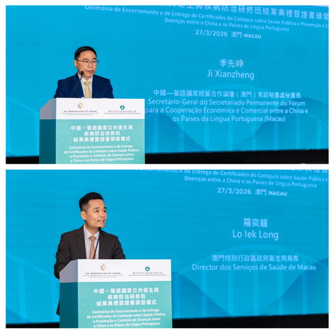 【本報消息】由中國—葡語國家經貿合作論壇(澳門)常設秘書處與政府衛生局聯合主辦的「中國-葡語國家公共衛生和疾病防治研修班」舉行結業禮。本期研修班於3月16日至27日舉辦,共有19名來自中國內地及九個葡語國家的官員和技術人員參加。中葡論壇(澳門)常設秘書處秘書長季先峥、衛生局局長羅奕龍、研修班輪值班長安娜.克莉絲蒂娜出席結業禮並致辭。