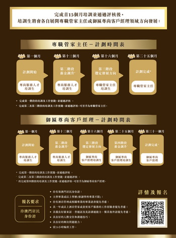 完成章程規定的培訓及通過評核後,表現優異者將有機會獲得晉升,按其所選發展方向分別獲晉升至專職管家主任或御匾尊尚客戶經理,薪酬亦會作出相應調整,從而促進本澳居民職業生涯向上流動與長期穩定就業。