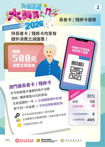 經科局於講解會上介紹是次活動兩項重點優化措施及安排,包括活動調整為「周末抽券、平日核銷」的模式,即於每周五至周日抽取電子優惠劵,並在周一至周四核銷電子優惠;持殘評證人士改為以「澳門通殘疾卡」領取額外的500澳門元消費立減優惠,無須再額外領取關愛卡;同時,長者及持殘評證人士均可憑有效澳門通「長者卡」或「殘疾卡」,於本澳逾100個指定服務地點拍卡領取上述額外優惠,務求便利合資格人士參與及受惠。