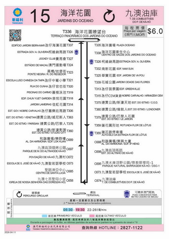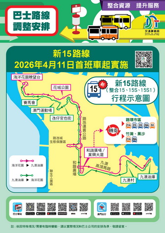4月11日起,由現時15、15S及15S1路線合併的新15路線將以往返海洋花園及九澳村的路線運作,班次頻率將加密到22至26分鐘。當中,將新增往來九澳高頂馬路及九澳油庫的行程,同時,前往路環市區、竹灣、黑沙等區域的乘客,則可透過轉乘其他路線繼續行程。