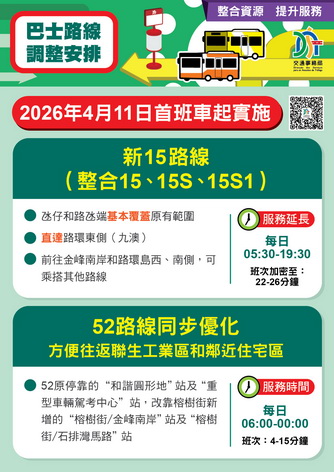 【本報消息】為優化公共資源配置,交通事務局持續透過數據分析客流,並與兩間巴士公司協調,推動路線重組與站點優化。4月11日起將實施新15路線的巴士服務,並調整52路線的行程,透過整合資源、加密班次、擴大覆蓋,為市民提供更便捷的巴士服務。