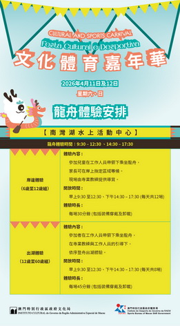 【本報消息】為發揮文化與體育的聯動作用,共同推動「活力澳門、文化澳門、幸福澳門」的建設願景,文化局與體育局將於4月11日及12日聯合主辦「文化體育嘉年華」,以南灣湖水上活動中心為主場,並走進本澳多個世遺景點及社區,為市民和遊客帶來一場融合傳統文化底蘊與現代城市活力的文體盛宴。