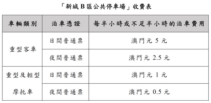 新城B區公共停車場由4月9日起投入使用,提供582個泊車位,包括319個重型客車泊車位,重型客車長度限制在12米內,以及263個重型及輕型摩托車泊車位;採用封頂式收費,重型客車在每連續24小時內的泊車費用上限為澳門元60元、重型及輕型摩托車在每連續24小時內的泊車費用上限為10元;停車場准許泊車的時間上限為連續八日。同時,參考其他戶外的公共停車場實施首15分鐘免費和半小時收費模式,鼓勵車輛流轉。