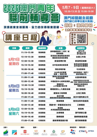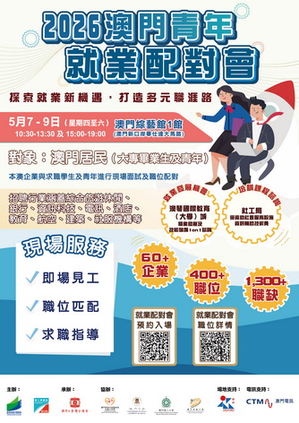 【本報消息】為協助澳門青年順利開展職業生涯及投入就業巿場,由教育及青年發展局和勞工事務局主辦、工聯承辦的2026「澳門青年就業配對會」及「澳門青年職前輔導會」,將於5月7日至9日一連三日於澳門綜藝館舉行。配對會及職輔會兩項活動由即日起於網上預約及報名。