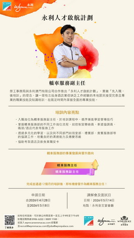 【本報消息】勞工事務局與永利澳門合作推出「永利人才啟航計劃」,以先入職、後培訓方式,協助本澳居民提升專業技能,促進其職業生涯向上流動,計劃由4月28日起接受網上申請。