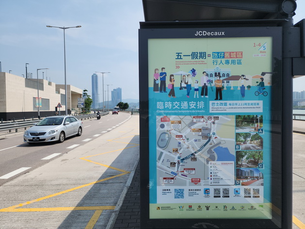 五月一日至四日期間關前後街及氹仔舊城區將繼續設置臨時行人專用區,相關範圍會實施封閉交通,巴士亦有臨時改道安排;五月一日至五日期間並會維持在新馬路、南灣、營地大街周邊、栢港停車場周邊、氹仔舊城區實施巴士站點整合或分流安排。