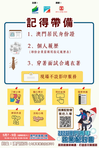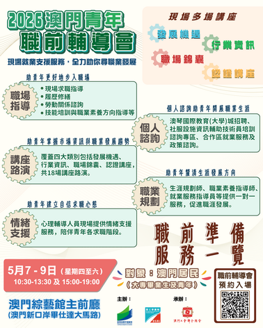 【本報消息】為協助澳門青年順利開展職業生涯及投入就業市場,由教育及青年發展局和勞工事務局主辦,並由工聯承辦的「澳門青年就業配對會」及「澳門青年職前輔導會」將於5月7日至9日一連三日於澳門綜藝館舉行。配對會及職輔會兩項活動由即日起可於網上預約及報名。