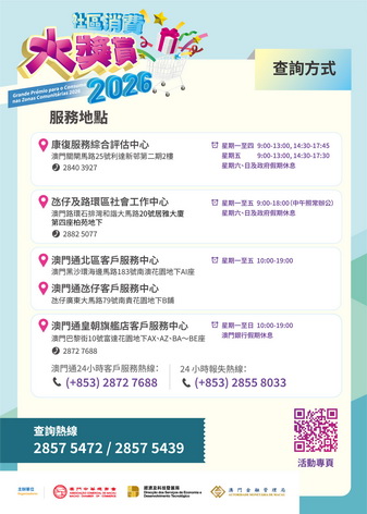 【本報消息】「2026社區消費大獎賞」活動已推出近三周,經檢視社會需求後,中南區(沙梨頭)社會工作中心、氹仔及路環區社會工作中心(氹仔分站)兩個服務地點將於5月4日起停止提供長者卡及殘疾卡首次申領、舊換新及補辦的服務。