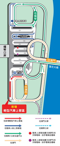 【本報消息】為持續優化橫琴口岸澳門口岸區的交通環境,理順各類車輛的上落客秩序,提升人車通行效率及安全,交通事務局經檢視口岸區交通樞紐平台空間,由5月1日起開放現時A車道(隨車人員上客區)旁的空間,並增設輕型汽車上客區,以應對高峰時段的上客需求,便利公眾出行。