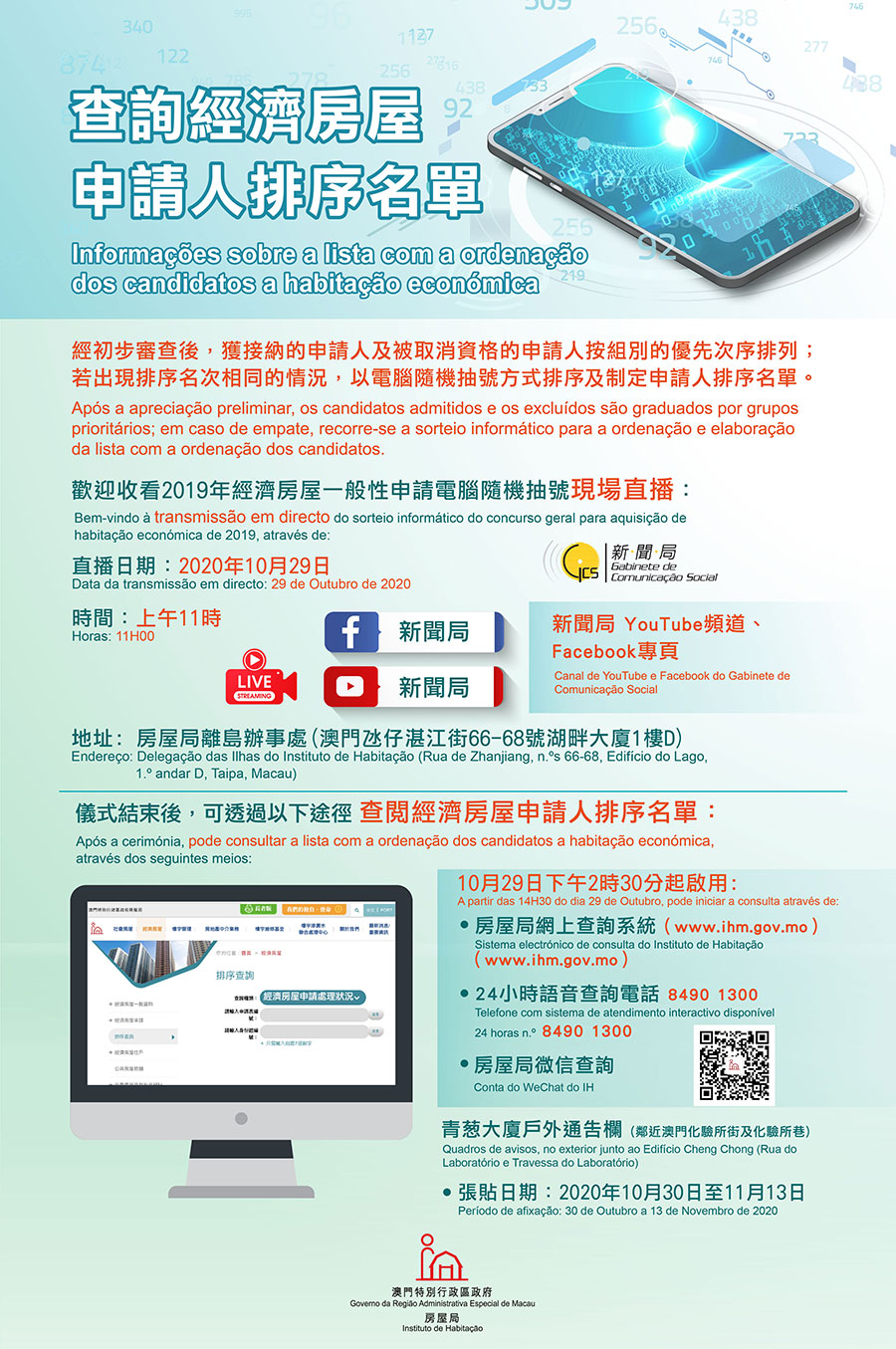 經電腦隨機抽號制定的申請人排序名單由2020年10月30日至11月13日張貼於鄰近澳門化驗所街及化驗所巷的青葱大廈戶外通告欄,供市民於辦公時間內查閱。為方便申請人查閱抽號排序,房屋局明日(29日)下午2時30分起開通網上查詢系統(www.ihm.gov.mo),房屋局微信及24小時語音查詢電話(8490 1300)。