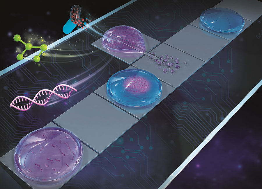 微流控技術因其微型化、集成化、消耗小等優勢,一直被認為在生物醫學研究中具有巨大的發展潛力和前景,被稱為“晶片實驗室”。然而經過數十年的發展,微流控技術並沒有如預期般在日常科學研究中廣泛運用。微流控平台普遍不為傳統實驗人員所採用的一個原因就是,相比傳統生化實驗中用移液器配液的方法,微流控技術中的非常規的樣品操作複雜且固化。在微流控晶片上,一般通過在特定結構中混合不同流體或者控制兩個液滴的融合以實現樣品配液,這使得配液濃度控制複雜而困難。澳大此項研究通過在玻璃微晶片上設計特殊的電極結構,使樣品液滴在高壓交流電場的驅動下定向噴射出“衛星液滴”並被拾取至其他樣品液滴中,以此實現樣品在晶片上的轉移和分配。通過外部電信號控制,可以便捷地在5pL~20nL範圍內對樣品遞送體積進行靈活精確控制,極大程度地接近傳統移液器的配液方式,避免了複雜繁瑣的操作程式。