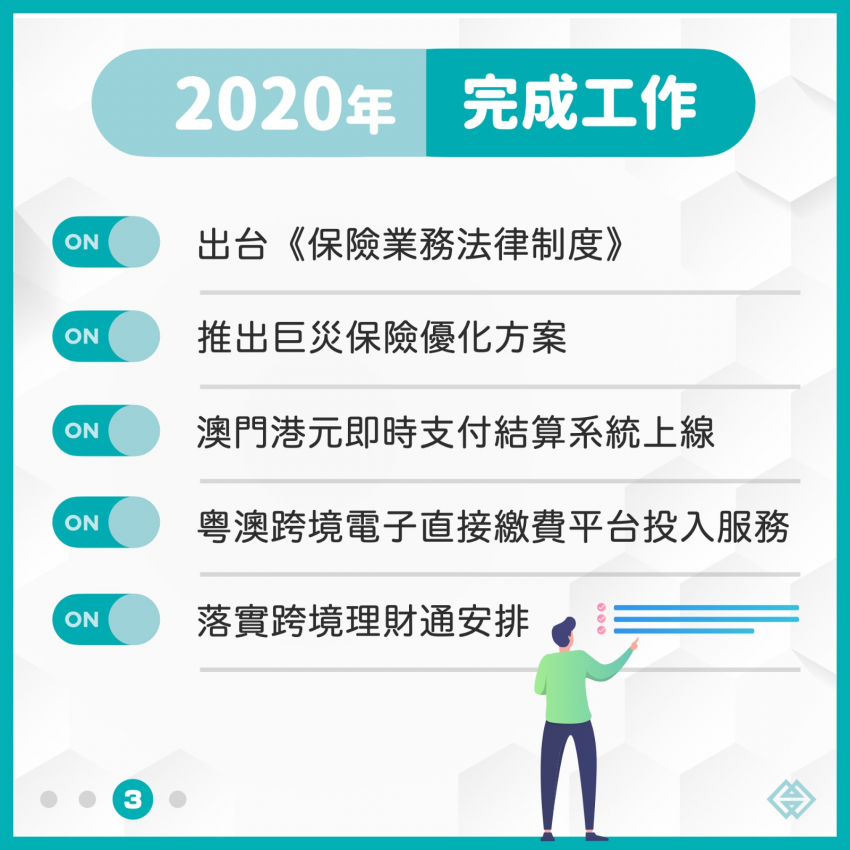 陳守信表示,為維持金融業的增長動力,金管局正從多方面推進現代金融業發展,包括軟基建方面,今年已出台《保險業務法律制度》,正跟進《金融體系法律制度》及《基金法》的修訂工作,並正推動《信託法》立法;硬基建方面,今年完成“澳門港元即時支付結算系統”及“粵澳跨境電子直接繳費系統”,並正有序推進移動支付工具於明年首季實現聚合;業務多元方面,正推動“跨境理財通”落地及債券市場發展。此外,今年因應低窪地區中小企對災害投保的需要,推出了巨災保險優化方案,多方面推動金融業進一步發揮支持澳門社會經濟發展的作用。