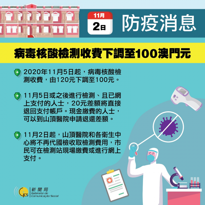 羅主任公佈,特區政府經與國檢(澳門)衛生檢測有限公司(下稱國檢)、鏡湖醫院、科大醫院協調,自2020年11月5日(星期四)起,在北安客運碼頭、澳門綜藝館、鏡湖醫院和科大醫院的四個病毒核酸檢測站的檢測收費,將由每次120澳門元下調到100澳門元,如已預約於11月5日或之後進行檢測,且已進行網上支付的人士, 20元差額將直接退回其支付帳戶,有關人士毋須額外申請退款,至於已預約於11月5日或之後進行檢測,且已以現金繳費的人士,可到仁伯爵綜合醫院申請退還差額。同時,由今(2)日起,仁伯爵綜合醫院和各衛生中心將不再代國檢收取病毒核酸檢測費用,市民可在檢測站現場繳費或進行網上支付。他其後補充,核酸檢測價格下調符合市民利益和期望,政府會一直與各檢測機構協商,爭取更低的核檢價格。現時內地的核檢費用是 75元人民幣,換算約為 90澳門元,兩地核檢費用已相當接近。