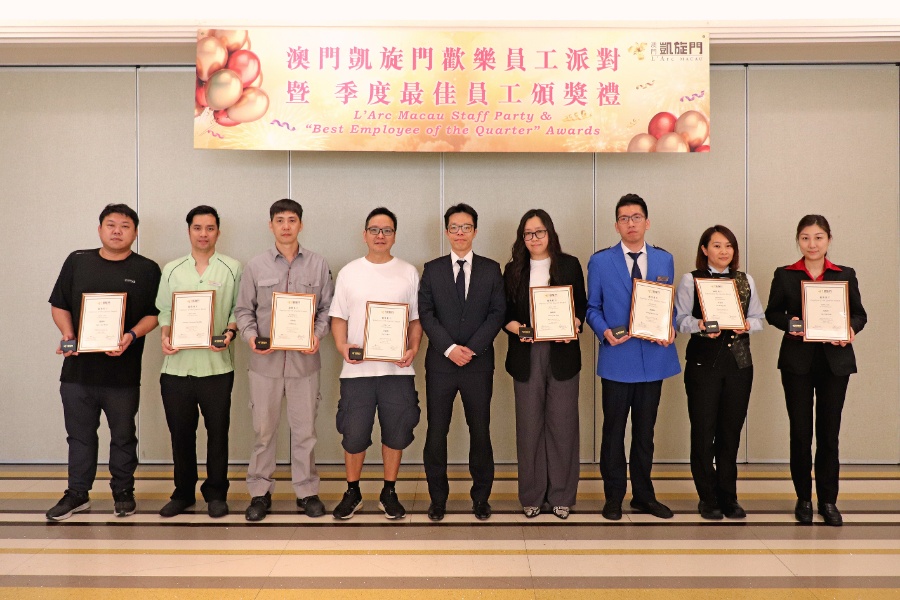 【本報消息】澳門凱旋門為表揚優秀員工的貢獻和出色表現,於昨日假酒店員工餐廳舉行「季度最佳員工」頒獎典禮。凱旋門管理層和各部門員工齊聚一堂,共同參與這場嘉許典禮。凱旋門「2024年第一季度最佳員工」得獎者分別是餐飲部何嘉棋、管家部Johmar Clemente Revilla、工程部李偉悅、資訊科技及影音部譚翠琴、娛樂場運作部馬雅芬及李放收、娛樂場保安部黃國輝、籌碼兌換處關慧珊。凱旋門人力資源及企...