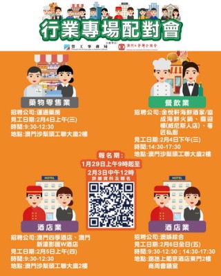 【本報消息】為協助有求職需求的澳門居民盡快就業,同時緩解業界人力資源需求和壓力,勞工事務局與工聯將於下周再度合作舉辦四場行業專場配對會,合共提供274個職位空缺,歡迎有求職需求的澳門居民報名參加。四場配對會共提供空缺274個,其中2月4日上午舉辦運通藥房專場配對會,提供20個售貨員職位空缺。同日下午舉辦餐飲業專場配對會,參與企業有金悅軒海鮮酒家/協成海鮮火鍋、馥迎樓(威尼斯人店)及粵匠私廚,合共提...