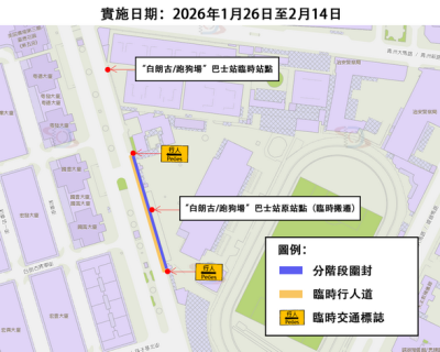 【本報消息】「逸園跑狗場原址土地市民運動公園建造工程—第一區」已正式動工,為保障施工範圍周邊的行人安全,公共建設局要求承建單位分階段建造有蓋行人通道,首階段建造工作將1月26日至2月14日進行,期間白朗古將軍大馬路近仁慈堂澳門盲人重建中心對出路段將實施有限度通車,相關咪錶泊車位將暫停使用。後續階段將安排在春節假期後施工。配合施工需要,1月26日日間路線首班車起,白朗古/跑狗場巴士站將往青洲大馬路方...