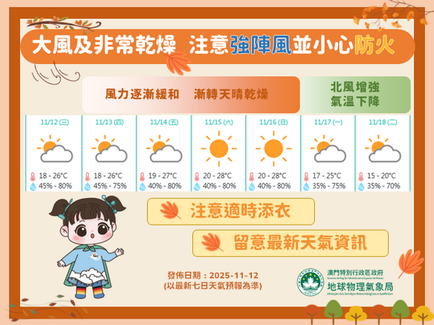 【本報消息】氣象局發出特別推送,指隨著日熱帶氣旋「鳯凰」遠離,東北季風將繼續主導華南沿岸天氣,而今年入秋後最強的一股東北季風將於下周抵達,屆時華南沿岸將顯著降溫,並預料下周中(18至19日)珠江口地區最低氣溫將下降至攝氏13至15度左右,氣象局將密切關注冷空氣強度變化,適時調整氣溫預測。氣象局指「鳯凰」促使局發出本年第14個風球,再度打破了單年發出最多風球記錄。「鳯凰」雖以超強颱風強度橫掃菲律賓...