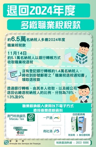 【本報消息】約6.5萬名多繳交2024年度職業稅稅款的納稅人,財政局已完成退稅程序,其中5.1萬名已登記銀行轉帳收取財政局給付的納稅人,退稅款於11月14日存入相關銀行帳戶內;餘下1.4萬名沒有登記銀行轉帳的納稅人,將陸續收到掛號郵寄之「職業稅退稅通知書」領取退稅款。透過銀行轉帳、由其本人收取退稅款及經公司退回佔總退稅納稅人的比例,分別為78%、13%及9%。職業稅納稅人於11月1日起已可透過財政...