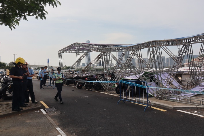 【本報消息】西灣湖廣場附近一個面積大約30米乘7米的大型金屬架周一早上突然倒塌,波及多架停泊在該處的私家車和電單車,幸無人受傷,警方和消防到場處理,初步相信金屬架被強風吹倒導致事故。事故現場為西灣湖廣場旁的泊車位置,倒塌的大型金屬架為即將在本周五開幕的澳門美食節大型招牌,消防表示於周一上午11時6分接報,指西灣湖景大馬路美食節附近發生大型鐵架倒塌事件,消防到場後發現倒塌面積約30米乘7米,波及至...
