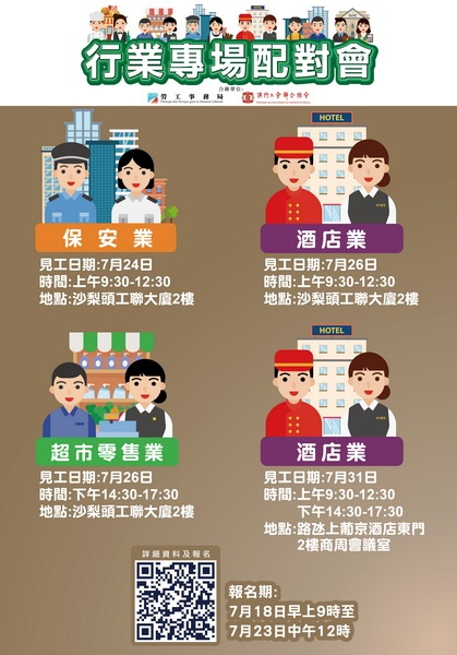 【本報消息】為協助有求職需求的澳門居民盡快就業,以及為緩解業界的人資需求的壓力,勞工事務局與工聯合作於七月底舉辦四場行業專場配對會,合共提供252個空缺。7月24日上午舉辦保安業配對會,提供109個職位空缺,涉及機場安檢員。7月26日上午舉辦酒店業配對會,提供九個職位空缺,涉及倉庫管理員、客戶聯絡中心專員、迎賓大使(行李服務員)、初級廚師及知客等。下午舉辦超巿零售業配對會,提供115個職位空缺,...