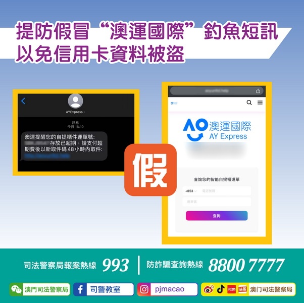 【本報消息】近日,司法警察局發現有騙徒隨機向市民發送大量假冒物流公司「澳運國際」的釣魚短訊,內容聲稱用戶存放自提櫃之貨物已逾期,要求用戶登錄短訊內附帶的連結並輸入信用卡資料支付逾期費,以取得新的取件二維碼,藉此套取事主的信用卡資料。司警局反詐騙協調中心再次提醒市民不論發訊息者為何人,切勿隨意點擊收到之手機短訊中附帶的連結;任何情況下如需透過互聯網輸入個人、銀行賬戶或信用卡資料,必須小心求證有關網站...