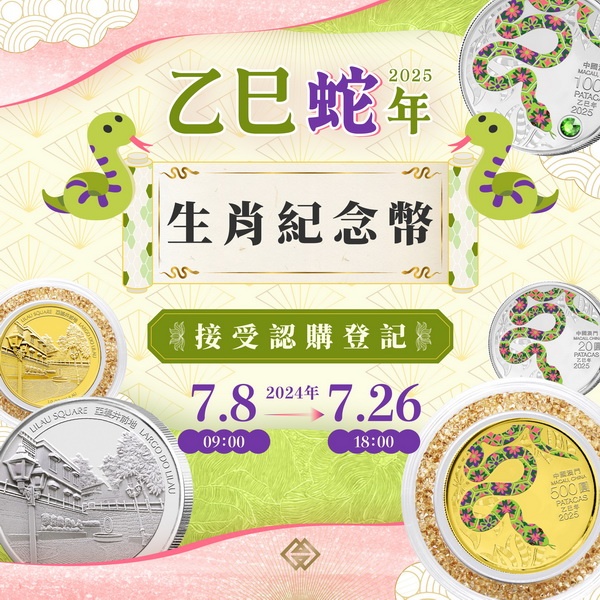 【本報消息】金融管理局即將發行2025乙巳蛇年生肖紀念幣,並由今日起接受網上認購登記。蛇年紀念幣正面以色彩繽紛且具葡萄牙風格的瓷磚構成農曆生肖圖案,背面則採用嶄新高浮雕技術,從仰視的視覺立體地呈現澳門世界文化遺產景點—亞婆井前地。蛇年紀念幣的規格包括壹安士及五安士精裝銀幣,以及零點五安士的精裝金幣,三款紀念幣的售價分別為1,380、8,000及16,500澳門元。持有澳門特別行政區居民身份證且年...