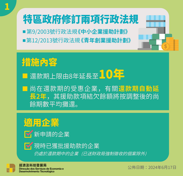 【本報消息】為紓緩中小企業償還貸款的壓力,特區政府透過第22/2024號行政法規《修改第9/2003號行政法規〈中小企業援助計劃〉及第12/2013號行政法規〈青年創業援助計劃〉》,將兩項計劃的還款期上限由八年延長至10年,並於今年6月18日起生效。規定除了適用於新申請企業外,也適用於現時仍處於還款期的受惠企業。此外,曾獲批「天鴿」中小企業特別援助計劃的受惠企業,亦同樣適用於本次調整還款年期上限的...