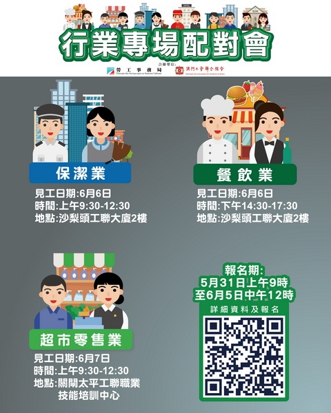【本報消息】為協助有求職需求的澳門居民盡快就業,以及為緩解業界的人資需求的壓力,勞工事務局與工聯合作在六月上旬舉辦三場行業專場配對會,合共提供385個空缺。 其中6月6日上午舉辦保潔業配對會,提供126個職位空缺,涉及巡更主任、押運隊長、編更員、電子及保安系統維修員、機場安檢員及清潔員。同日下午舉辦餐飲業配對會,提供145個職位空缺,涉及餐廳經理、收銀主任、烘焙領班、廚師、廚師助...
