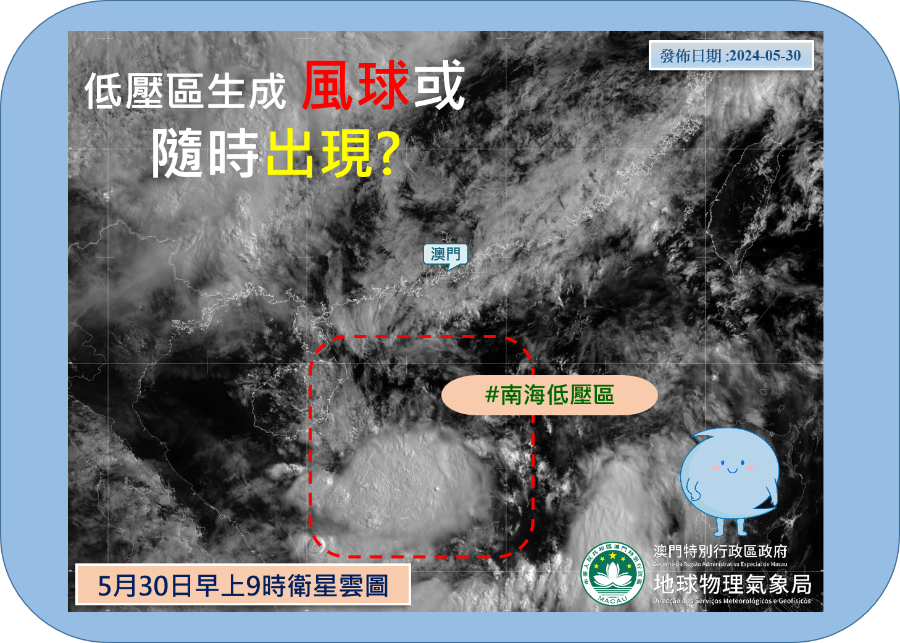 【本報消息】南海中部一道廣闊低壓槽相關的對流雲團,在周四下午發展成為低壓區後進一步增強為熱帶氣旋,氣象局也宣佈在下午五時半懸掛一號風球,預料該熱帶氣旋未來一兩日將靠近華南沿岸。受其影響,本澳未來兩日(5月31日及6月1日)將有驟雨及雷暴,風勢會較大。