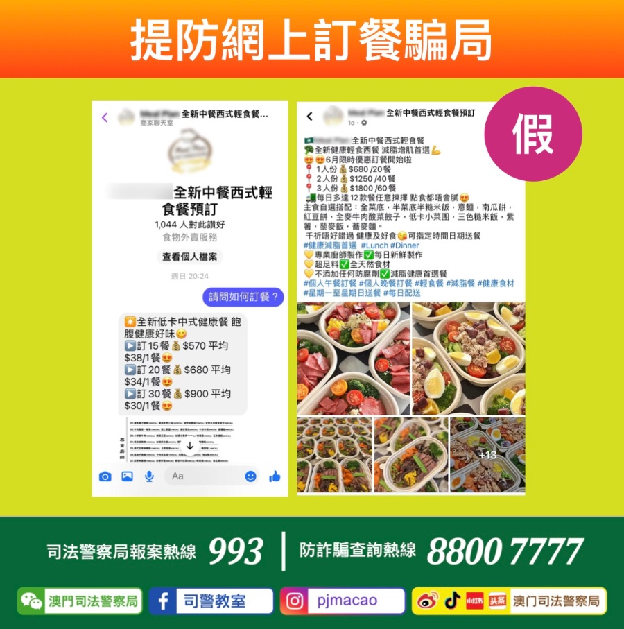 【本報消息】近日司警局先後接獲逾十名市民檢舉,報稱早前各自透過網上社交平台找到一個聲稱可提供「輕食餐」訂餐服務的專頁,該專頁以優惠價一次性訂購大量餐點為招徠,吸引各名事主分別向其訂購了多份餐點又或分多日供應之送餐服務,並以網銀向對方轉賬全數相關訂餐費用。及後,對方並未依約定時間送餐且失聯,更被有關專頁加至黑名單,各人始懷疑被騙。事件中各名事主報稱損失由數百至千餘澳門元不等,合共損失逾8,000元...