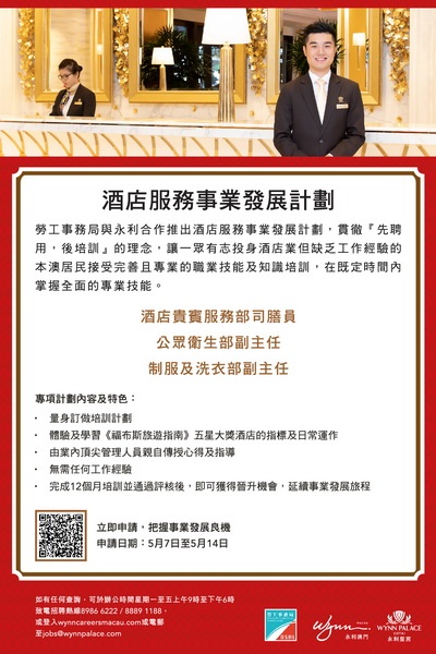 【本報消息】為培育本地人才,提供職業發展機會,勞工事務局和永利澳門合作推出「永利酒店事業發展計劃」,以先入職、後培訓方式,為有志投身綜合休閒旅遊服務行業的澳門居民提供一系列的專業培訓及工作實踐,計劃由5月7日起接受申請。計劃提供貴賓服務司膳員、公眾衛生部副主任及制服及洗衣部副主任職缺各五個,合共15個職缺。獲錄取參加計劃者,永利澳門將安排一系列專業培訓及工作實踐。其中貴賓服務司膳員的培訓內容包括貴...
