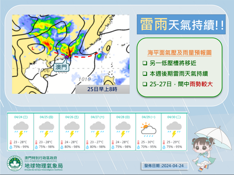 【本報消息】本澳近日持續受不穩定天氣影響,經過全日陰天有雲的周三後,氣象局預料本澳周四至周六驟雨將再次增多,並有雷暴及有強烈陣風,有可能造成水浸,暫時預測周四初時雨勢有時頗大,氣溫介乎攝氏22至27度。展望未來一星期只有下周一會短暫時間有陽光,但下周二起又回復到驟雨和雷暴天氣,當局再次提醒居民出門前留意最新天氣資訊。周三日間基本維持「天陰陰」,但經過連日有雨的天氣後,不少居民都不敢不帶雨傘出門,...