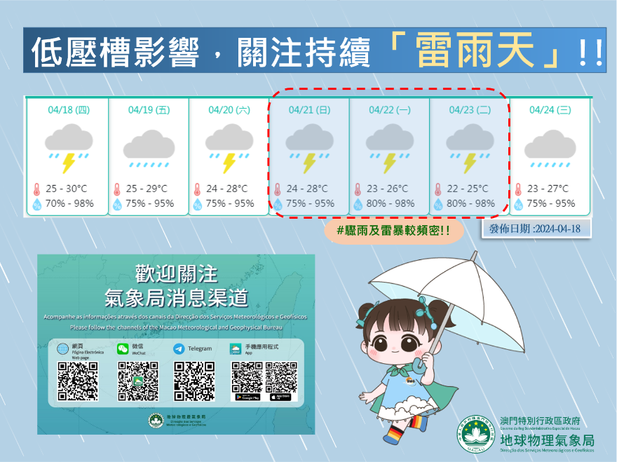 【本報消息】氣象局指正值春季的四月中旬,本澳近日的天氣卻彷彿進入炎炎夏日一般,但隨著高空反氣旋減弱,珠江口昨日也出現雷雨天氣,另外,預料一道低壓槽將於周末開始移近華南沿岸,本澳下周初的驟雨及雷暴天氣將進一步增多,而最高氣溫則將會有所緩和。氣象局早上10時15分一度發出特別信息,指預料未來兩小時將有雷雨區影響澳門及相鄰地區,本澳可能會出現大雨,呼籲市民留意。及後隨著雨勢增大,氣象局也於早上11時45...