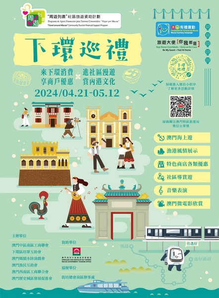 【本報消息】旅遊局持續透過資助計劃,鼓勵澳門社團舉辦多元化旅遊活動或項目,帶動社區經濟。旅遊局於四月份資助社團推出「旅遊探路者的大冒險—濱海尋寶篇」、「下環巡禮」及「潮遊觀音文化」,讓旅客和居民以不同方式探索澳門各區獨特「旅遊+」元素,豐富遊澳體驗,帶動社區人流及消費。「旅遊探路者的大冒險—濱海尋寶篇」結合海上遊、景點介紹和尋寶解謎等元素。主辦單位安排於剛過去的周末以及本月27及28日一連兩周合...