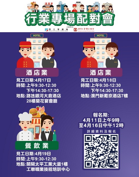 【本報消息】為協助有求職需求的澳門居民盡快就業,以及為緩解業界的人資需求的壓力,勞工事務局與工聯合作於本月第三周舉辦三場行業專場配對會,合共提供178個空缺。4月17日全日舉辦酒店業配對會,提供79個職位空缺,涉及餐廳助理經理、銷售主任、食品監控主任、餐飲部長、客戶服務專員、餐飲接待員、廚師及保安員等。4月18日全日舉辦酒店業配對會,提供22個職位空缺,涉及機電工程督導、技術員(機電)、技術員(...