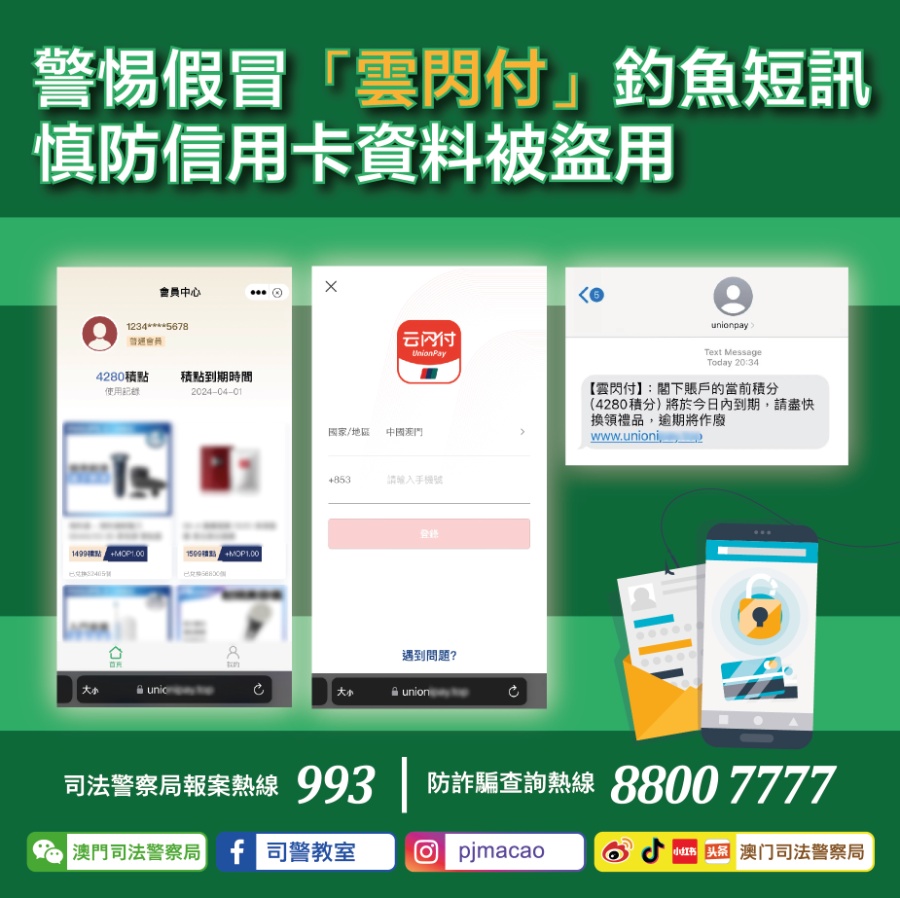 【本報消息】司警局近日先後接獲十多名市民檢舉,報稱收到以電子支付平台「雲閃付」名義發出的短訊,內容以「積分即將到期」為由誘使事主點擊短訊內附帶之連結,繼而進入一個假冒網站並可以低價及積分兌換禮品,藉此套取事主的個人及信用卡資料,事主在輸入一次性驗證碼後,最終導致信用卡被盜用,造成各事主數千至數萬元不等的損失。由於上述案件中騙徒透過技術手段將發出之釣魚短訊號碼更改成與雲閃付官方號碼一致,從而使事主手...