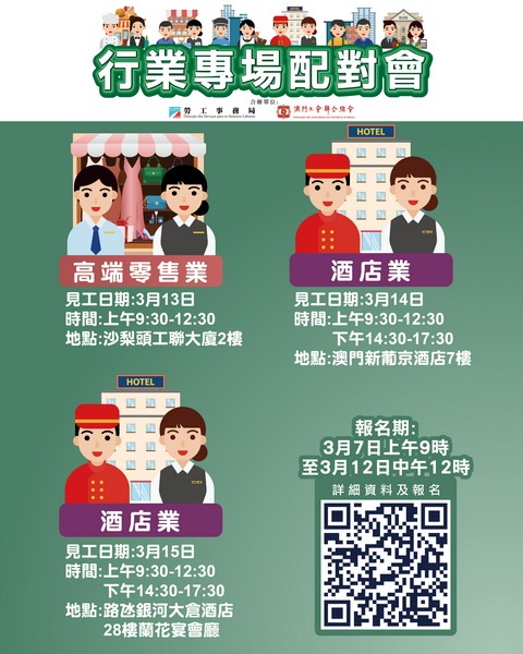 【本報消息】勞工事務局與工聯繼續合作於下星期舉辦三場行業專場配對會,合共提供169個空缺。報名日期由3月7日上午九時至12日中午12時。3月13日上午舉辦高端零售業配對會,提供10個職位空缺,涉及銷售員。配對會在工聯二樓(沙梨頭海邊街2-6號工聯大廈)舉行。3月14日全日舉辦酒店業配對會,提供26個職位空缺,涉及機電工程督導、機電技術員、廚房機電裝置技術員、冷氣系統技術員及給排水系統技術員等。配...