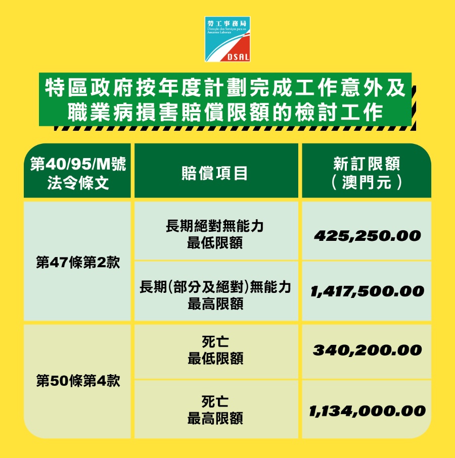 【本報消息】根據第40/95/M號法令《核准對工作意外及職業病所引致之損害之彌補之法律制度》的規定,對僱員因工作意外或職業病所引致的損害賠償的限額應每年作出分析,且在考慮社會發展狀況及通貨膨脹率,以及聽取勞工事務局及金融管理局的意見後,得以行政命令調整。按照年度計劃,特區政府已完成檢討有關賠償限額於2022年期間的實施情況。經綜合分析及考慮上述法例實施期間的本澳經濟和勞動市場狀況的數據、各項賠償...