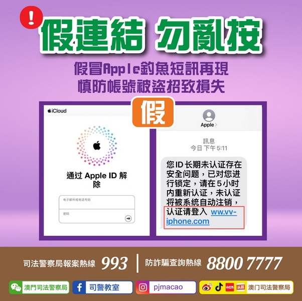 【本報消息】近日司法警察局發現有騙徒再次假冒Apple公司,隨機向大量市民發送附有釣魚連結之短訊,內容訛稱市民帳號存在安全問題而被鎖定,需透過短訊內之連結登入並進行認證。有關連結跳轉之網頁與Apple公司之官方登入網頁極為相似,倘市民不慎進入該網頁並輸入相關登入資料,將會被騙徒盜用Apple ID帳號作不法用途,甚至招致損失。司警局反詐騙協調中心呼籲市民時刻保持警覺,切勿隨意點擊任何短訊內之連結;...