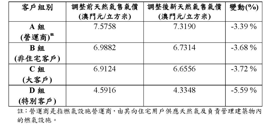 【本報消息】周一出版的《特區公報》刊登第16/2024號行政長官批示,批示核准下調天然氣售氣價格並由即日起生效,同時廢止第31/2023號行政長官批示。根據批示,調整後的四個客戶組別售氣價格分別下調約 3.3%至 5.5%,其中向住宅客戶供氣的營運商(A組)售氣價格降幅 3.3%,每立方米約 7.3 1澳門元。不過對比行政長官於去年同意天然氣售氣價格上調的31/2023號行政長官批示加幅,今次減...