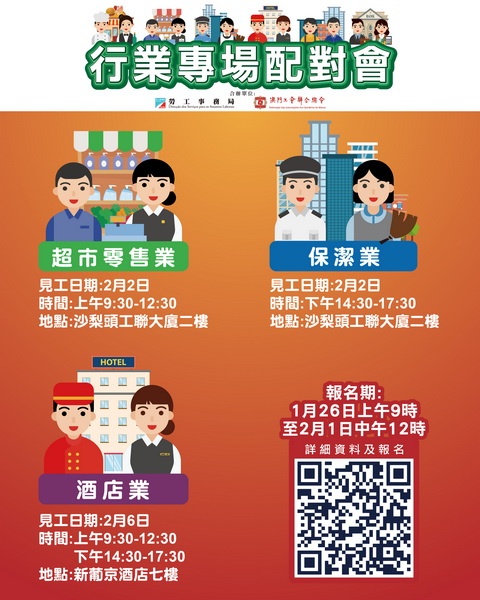 【本報消息】為協助有求職需求的澳門居民盡快就業,以及為緩解業界的人資需求的壓力,勞工事務局與工聯合作於二月上旬舉辦三場行業專場配對會,合共提供300個空缺。報名日期由1月26日上午九時至2月1日中午12時。2月2日上午舉辦超市零售業配對會,提供123個職位空缺,涉及見習經理、理貨主任、客服主任、收銀員、理貨員、包裝員、跟車送貨員及肉類處理員等。下午舉辦保潔業配對會,提供108個職位空缺,涉及保安部...