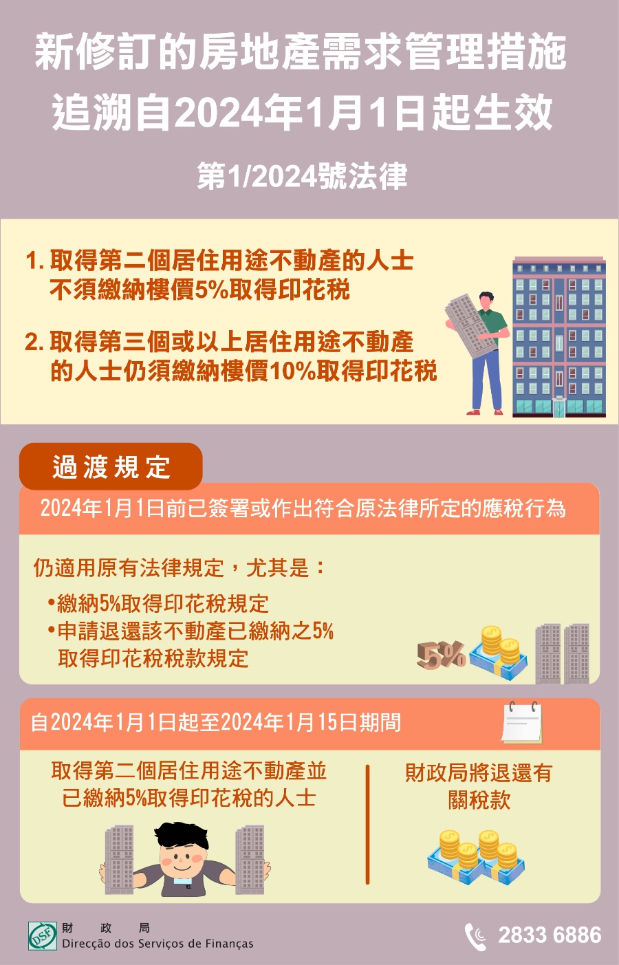 【本報消息】為了減輕換樓人士的稅務負擔以及改善居住環境的訴求,經綜合考慮本澳房地產市場及經濟形勢後,特區政府適度調整房地產需求管理措施,有關措施追溯自今年1月1日起生效。根據2024年1月16日生效的第1/2024號法律《取得第三個或以上居住用途不動產的印花稅》,取得第二個居住用途不動產的人士不須繳納樓價百分之五的取得印花稅,但對於取得第三個或以上居住用途不動產的人士仍須繳納樓價百分之十的取得印...